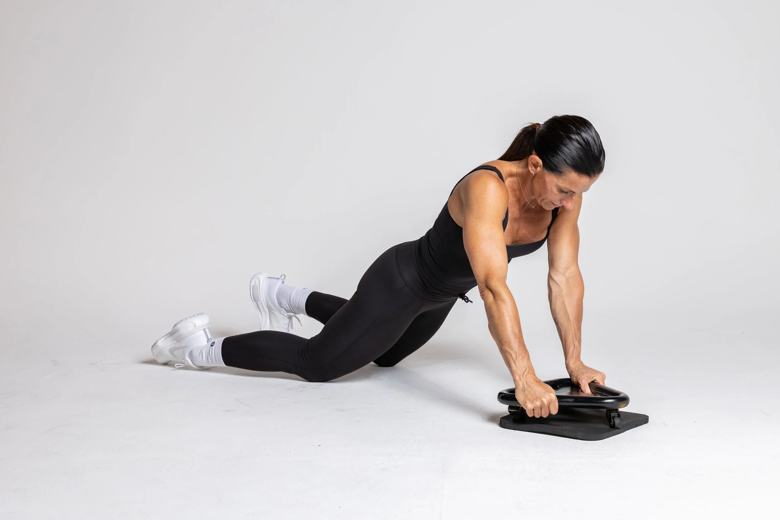 Single-arm Upright Row - Hold the triangle in one hand. Pull it up along your body to chest height, elbow leading. Lower with control. Keep core tight and shoulders relaxed.
