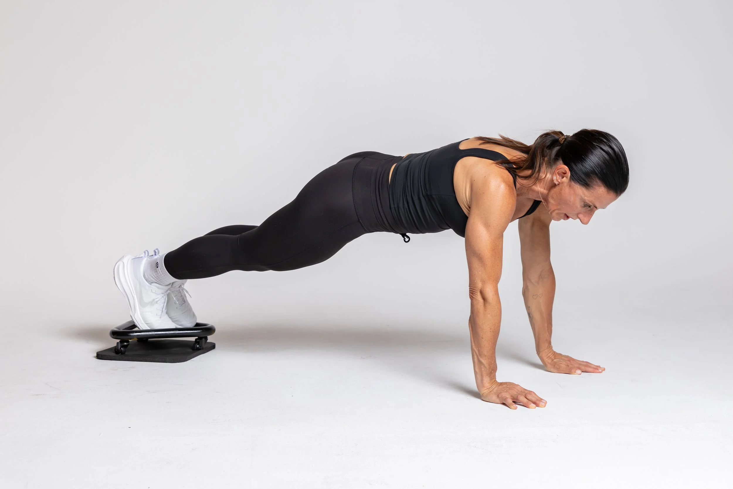 Chest Press- elbows start at 90 degree, press arms straight over chest line, add leg lifts for more challenge.